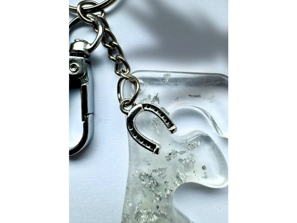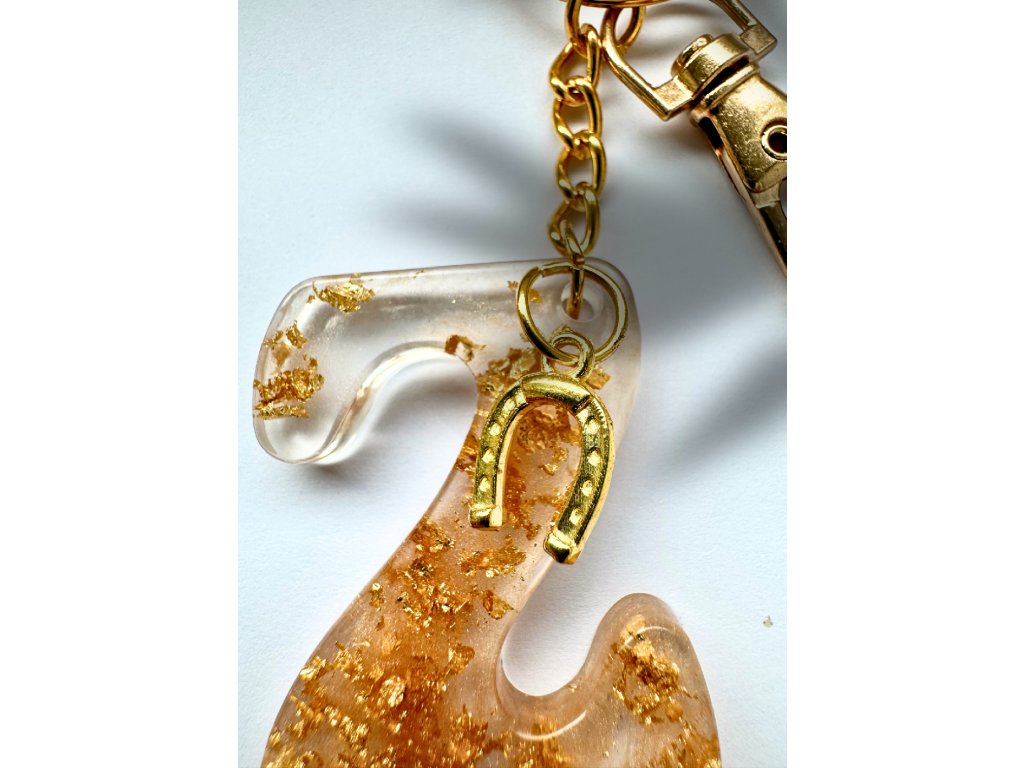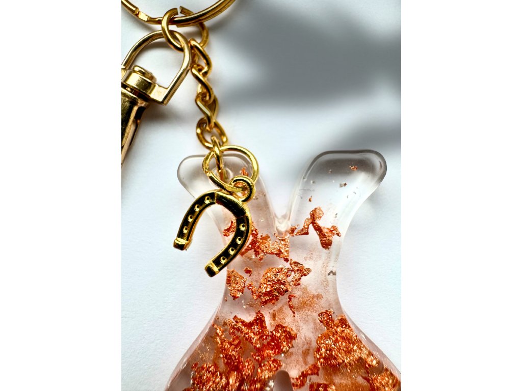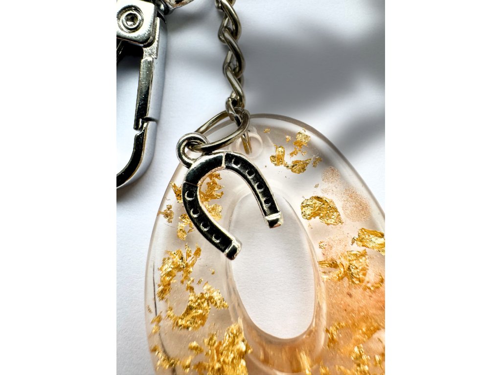 Klíčenka z pryskyřice zdobená zlatými, stříbrnými nebo rose gold vločkami a metalickým pigmentem ve stejné barvě. Klíčenku můžete nakombinovat se zlatým nebo stříbrným kováním. Součástí klíčenky je kroužek na klíče, karabinka a ozdoba ve tvaru podkovy.