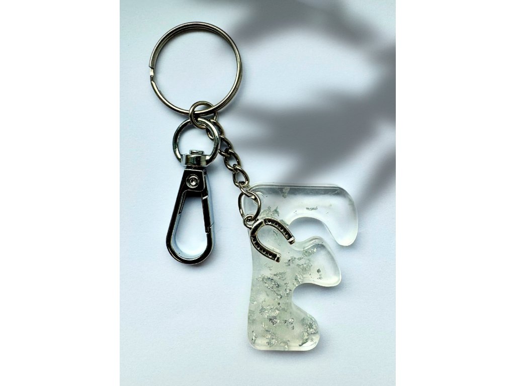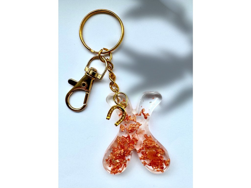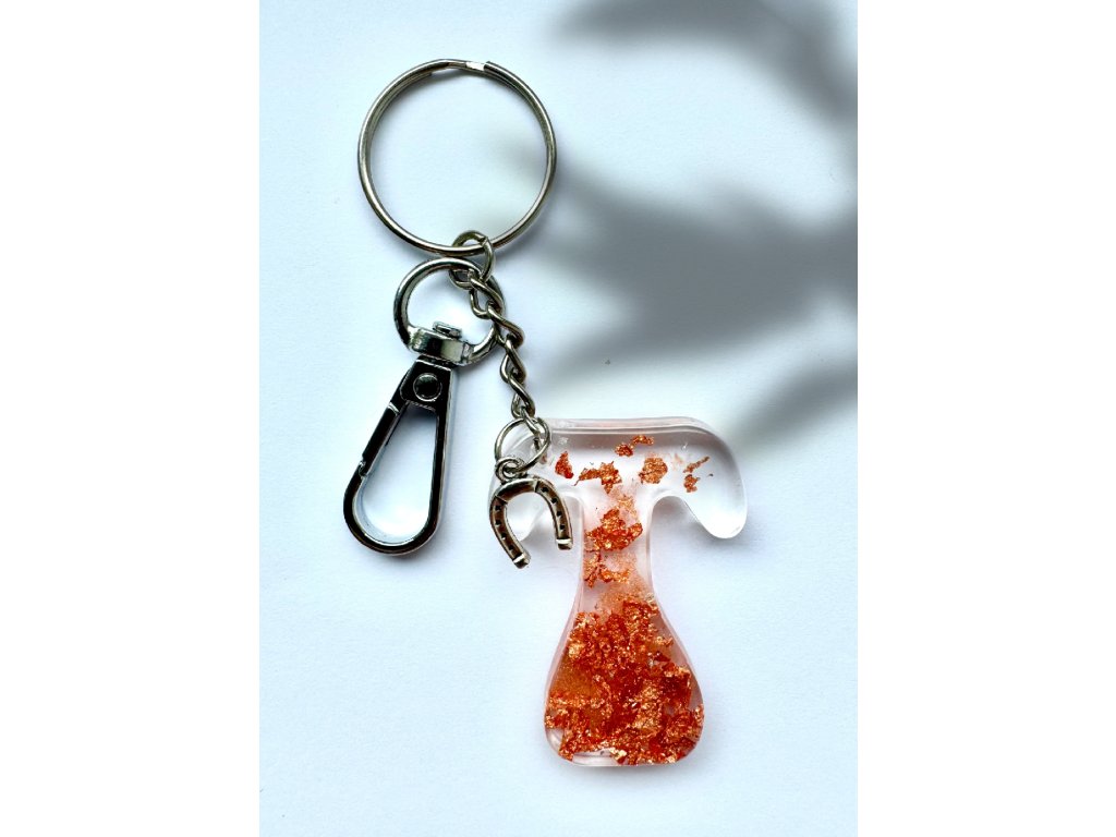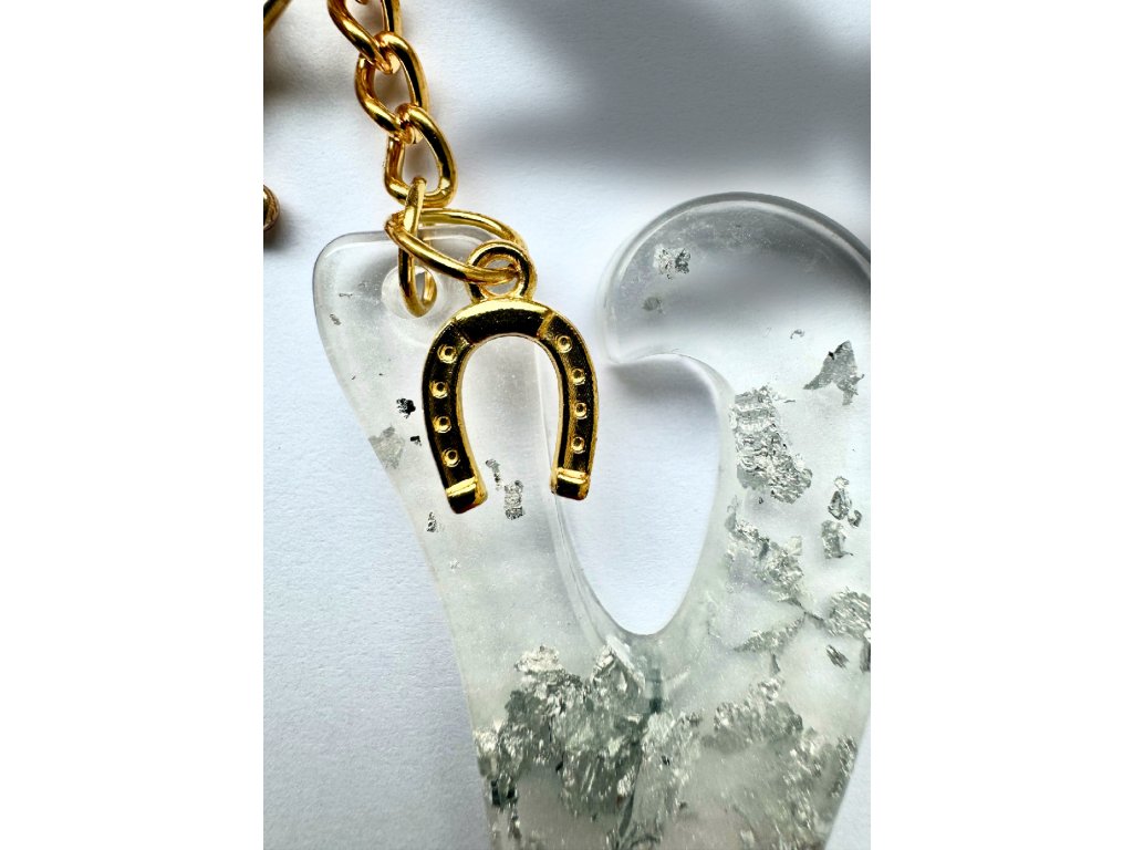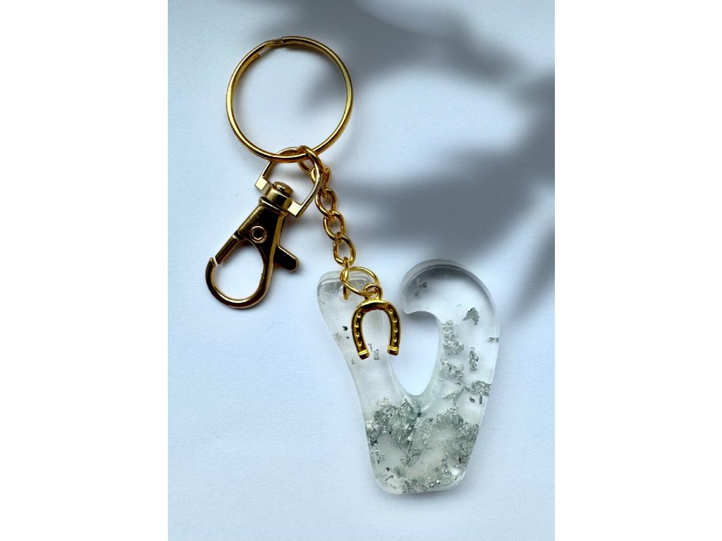 Klíčenka z pryskyřice zdobená zlatými, stříbrnými nebo rose gold vločkami a metalickým pigmentem ve stejné barvě. Klíčenku můžete nakombinovat se zlatým nebo stříbrným kováním. Součástí klíčenky je kroužek na klíče, karabinka a ozdoba ve tvaru podkovy.